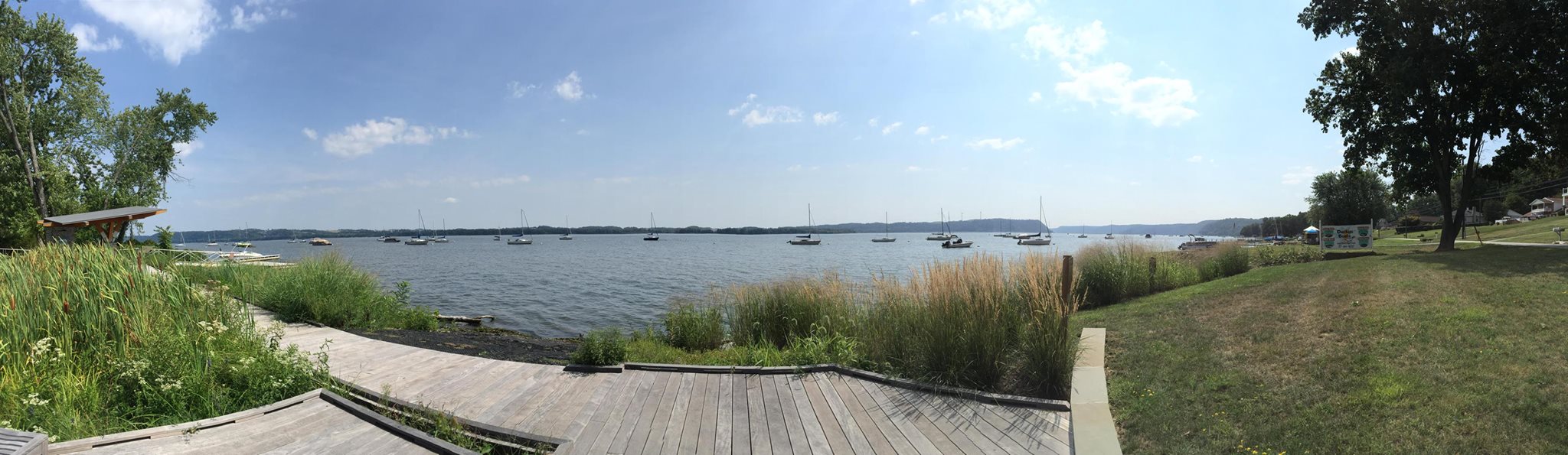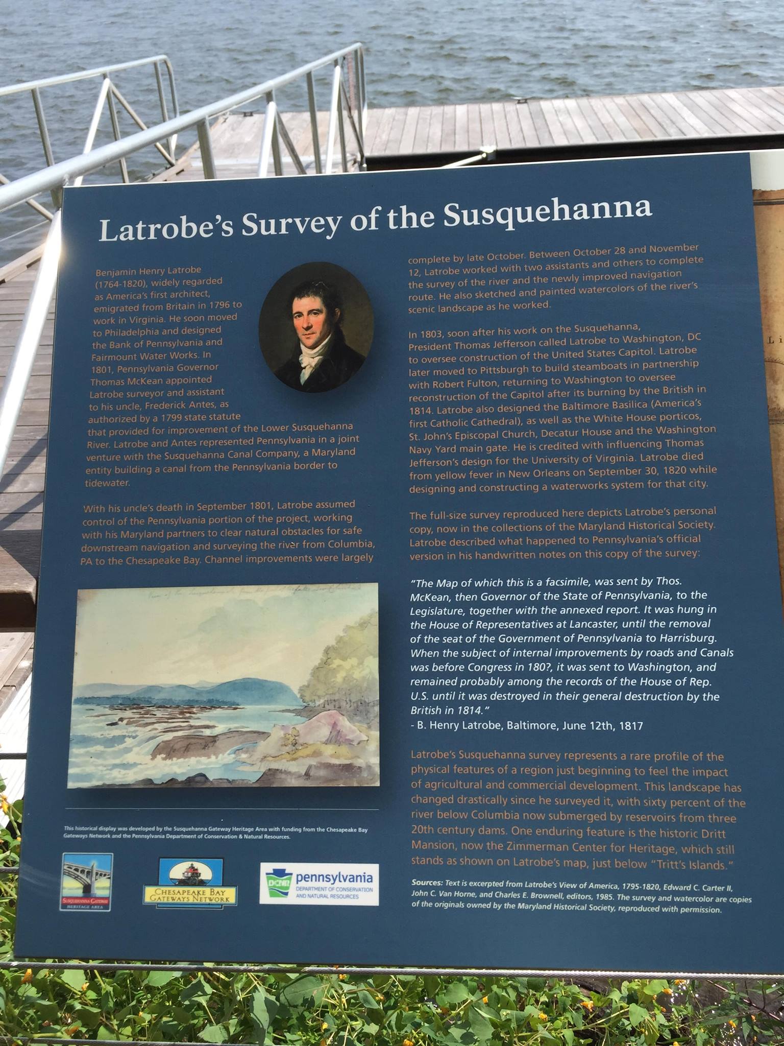 L make it clear that the importance of landscapes to descendant communities today is central. But my question is, who is the audience or viewer of the landscape? Yesterday, as I paused for a meeting at the Zimmerman Heritage Center on Long Level, I was thrilled to see the progress that had been made there in creating interpretive materials for the passing public. A stylish jetty on the waterfront has been built, shaded by a sloping roof and lined with benches wide enough to provide work space for me and my computer and my collaborators. In front of us, a full size replica of Benjamin Latrobe’s glorious survey of the Lower Susquehanna, commissioned by the Pennsylvania State legislature for the “improvement” of the river from Columbia down to the head of the Bay, is displayed, revealing a water viewscape radically different from that which confronts today’s visitors who can read, “Latrobe’s Susquehanna survey represents a rare profile of the physical features of a region just beginning to feel the impact of agricultural and commercial development.” As true as this is, the view across the river, now a lake, also points us in the direction of Washington Boro, the site of dense Native American settlement and horticulture/agriculture during the timeframe delineated by the requirements of the Indigenous Cultural Landscape initiative. Benjamin Latrobe’s survey certainly gives the viewer an idea of the radical change in the river thanks to the hydroelectric dams of 20th century energy production, but what it does not tell us is that this was a center of trade, exchange, agriculture and human interaction with the environment for hundreds of years prior to his “clearing” or dynamiting of a channel up the river. This part of the story is told behind the viewer. Turn around and climb the escarpment and you will find the “Native Lands County Park”, which at my last visit to this place was just an idea. Now the visitor can learn about the last known village of the Susquehannock Indians that stood on top of this hill (1676-1680) (the Byrd Leibhart site) where once 3,000 people lived in a stockaded four acre village in 16 ninety foot longhouses. The view from this hilltop reveals the wide sky, water and rolling hills of the Piedmont, now punctuated with wind turbines and McMansions. But the sense of this landscape is strong enough to blot out those intrusions of 21st century America (for now).