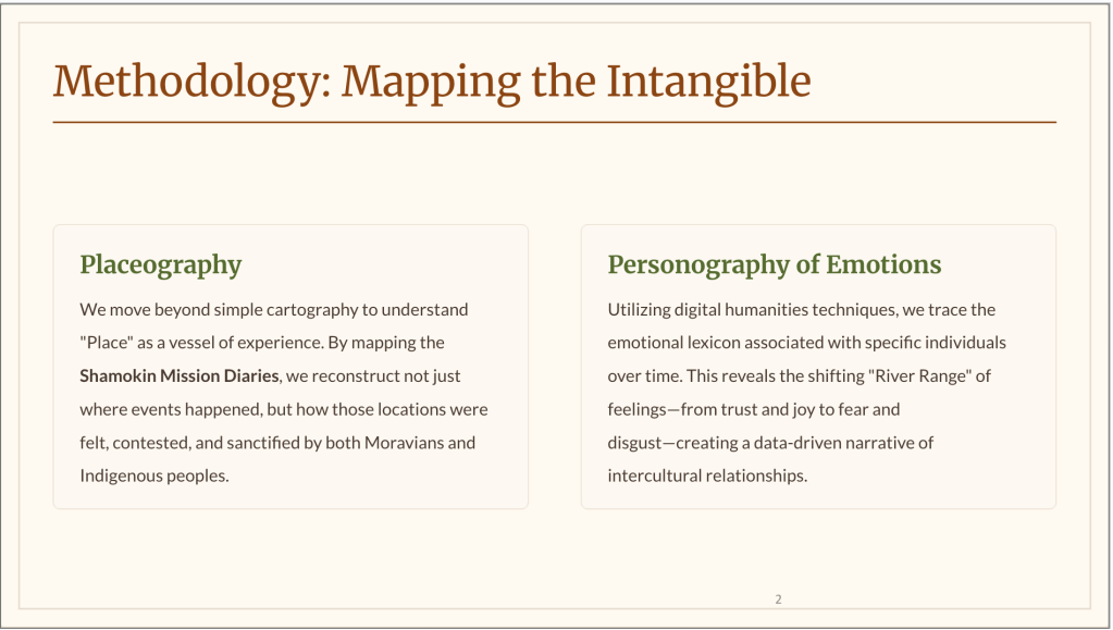 The emotional geography reveals that the sacred for the Moravians wasn’t fixed in land but in relationships and divine action. How did this understanding differ from Indigenous sacred landscapes? The Shamokin diary shows that both groups navigated the tension between place and the need to be mobile. Therefore, the relationship to place was not simply “fixed” or “portable”. For the Moravians, Christ is portable (they can worship anywhere). However, through the text we can see that their emotions showed a strong longing for Bethlehem, and when crisis arose, it forced a flight to their permanent sacred centre.