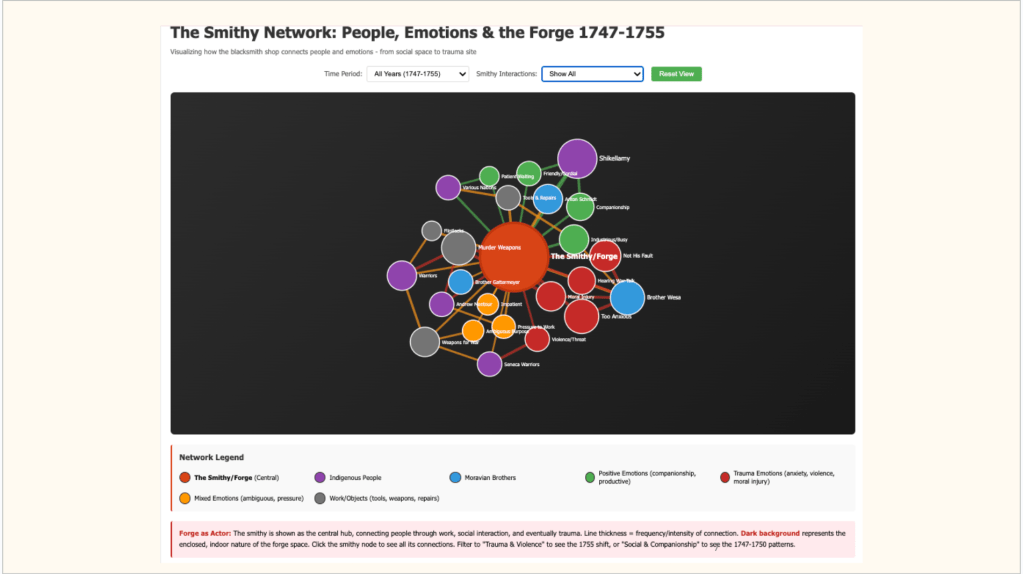 Looking at the smithy as a fulcrum of emotion and agency, we can view this diagram which us designed to show emotions connected to the smithy over time. For example, if one wants to talk of an emotional register, the smithy in 1755 is a place of impossible choices for Brother Wesa. A place that had once been a space of Shikellamy’s companionship (1747-8) had become a site of trauma (1755) where Wesa is forced to repair the bloodstained weapons of war.