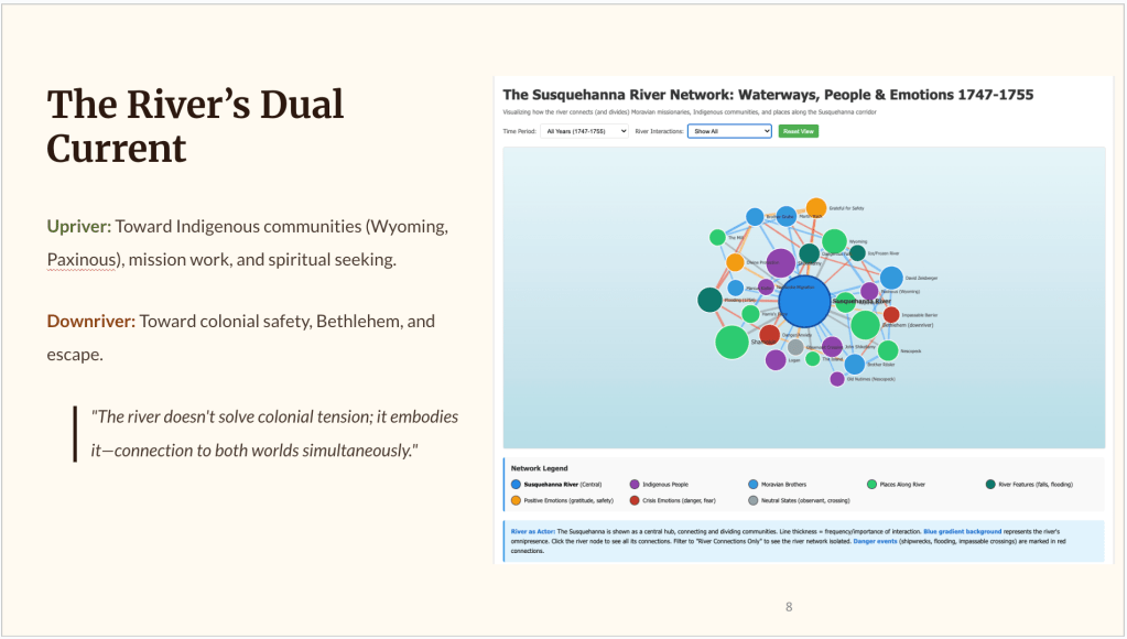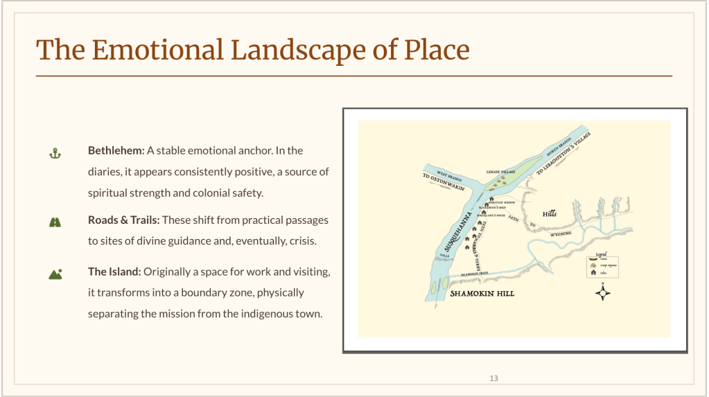 The Moravians sought a “portable sacred” – Christ present anywhere. But the emotional geography of the Shamokin diary reveals they couldn’t escape place through theology, in that they couldn’t worship safely without Indigenous protection (Shikellamy made devotion possible); they couldn’t resolve moral complicity in one place (the forge), so they fled to another (the river) where suffering could be explained theologically. And finally, they couldn’t stop longing for one specific place (Bethlehem).