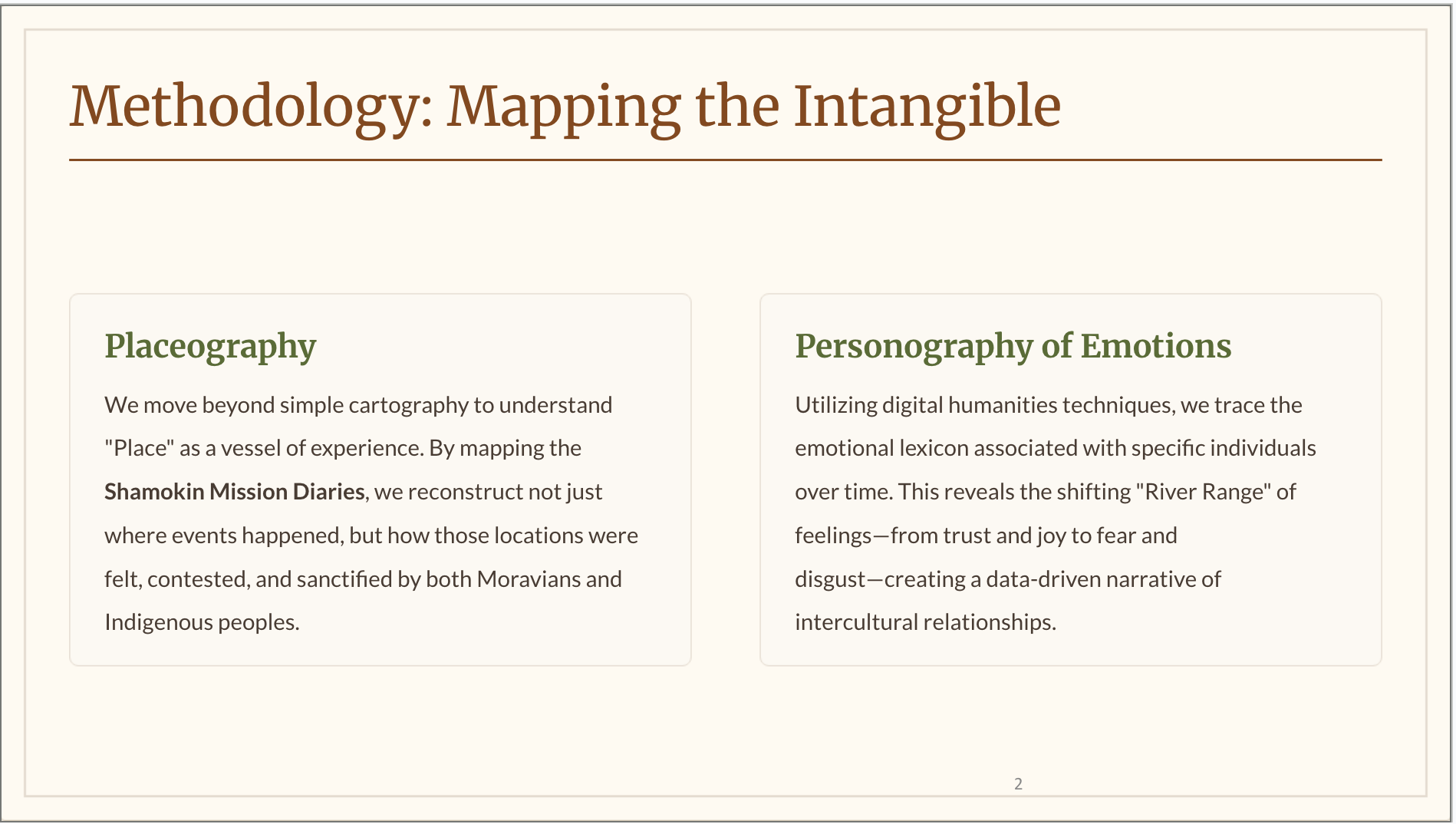 This paper explores the relationship between emotion, agency, and topography that emerged at Shamokin through the Moravian mission presence from 1742 to 1755, in the critical years preceding the French and Indian War. Drawing on the recently translated and published mission diaries (Faull, 2024), I examine how Shamokin differed from other Moravian settlements in colonial America. Unlike Bethlehem or Gnadenhütten, which were established as intentional communities, Shamokin existed as what Count Zinzendorf recognized as a spiritually strategic location where Moravians operated under explicitly negotiated Indigenous constraints (Merritt, 2003; Pointer, 2020).