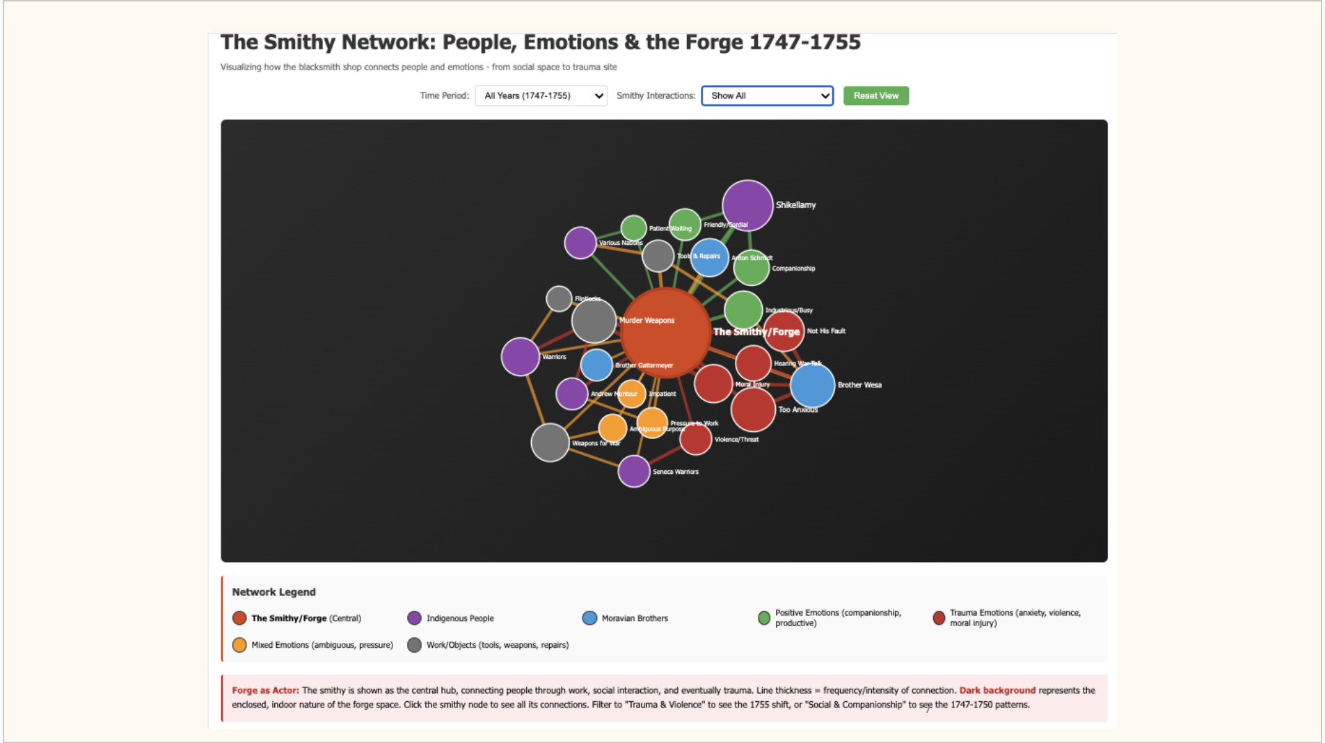 Looking at the smithy as a fulcrum of emotion and agency, we can view this diagram which us designed to show emotions connected to the smithy over time. For example, if one wants to talk of an emotional register, the smithy in 1755 is a place of impossible choices for Brother Wesa. A place that had once been a space of Shikellamy’s companionship (1747-8) had become a site of trauma (1755) where Wesa is forced to repair the bloodstained weapons of war.