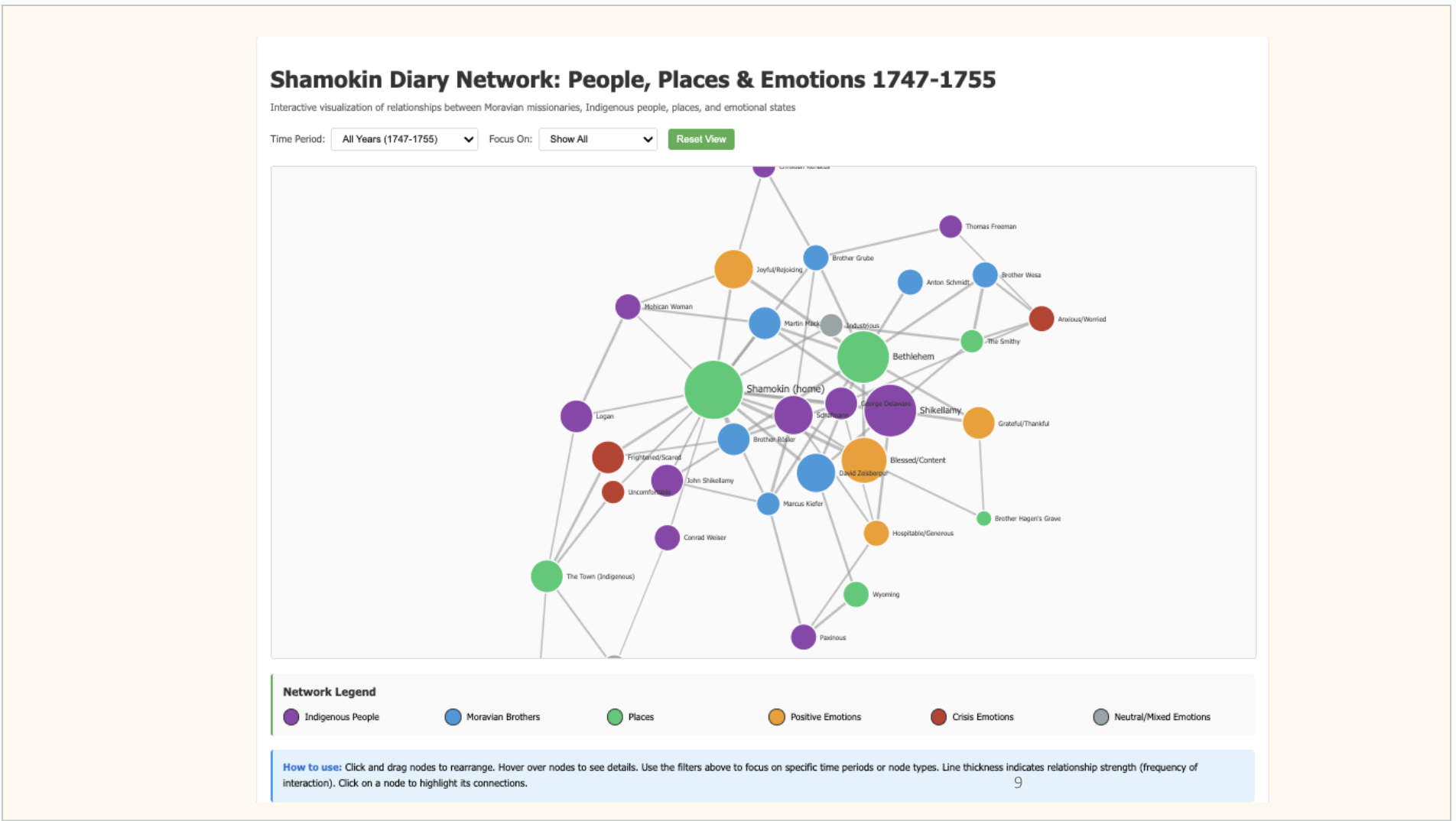 In my presentation, I focussed on the recently published Shamokin Diaries, analyzing the language of the text to build visual models of relationships between people, place and emotion. These visualizations allow us to explore the change in sentiment related to specific places (the river and the smithy) and people over the period the Moravian missionaries were working at the confluence. I reproduce these visualizations and the talk here.